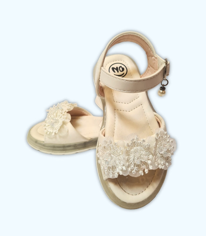 Chic beige dress sandals with decorative trim for formal or casual occasions. Adjustable ankle strap and cushioned footbed ensure a stable, comfortable fit.